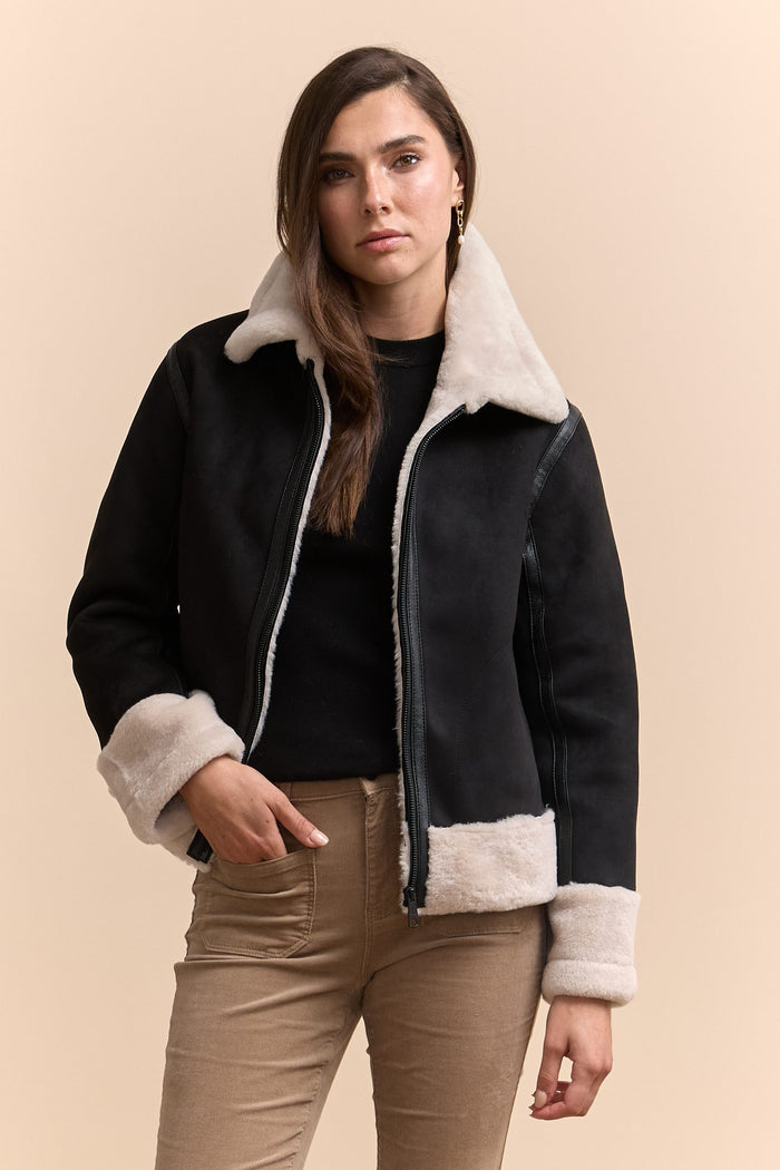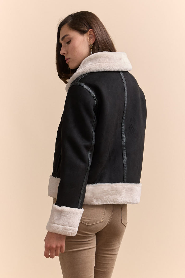 Stay warm and stylish in this chic faux shearling coat! Its plush lining provides cozy comfort, while the sleek outer fabric adds a touch of modern elegance. Perfect for layering over your favorite outfits, this coat transforms any cold day into a fashion statement.