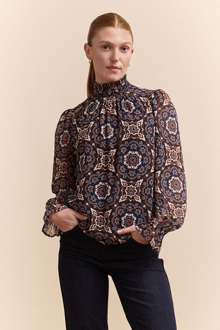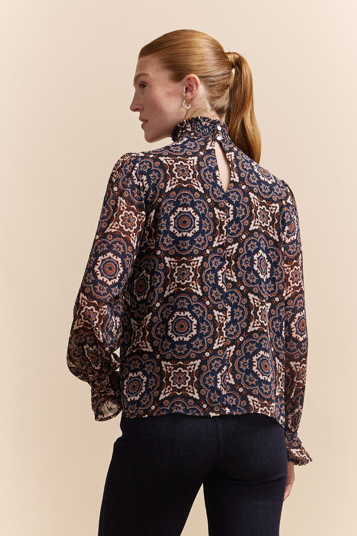 Add a splash of sophistication to your wardrobe with this fluidly printed blouse. The intricate pattern and ruching detail highlight your refined taste, making it a perfect match for both casual walks and office elegance.