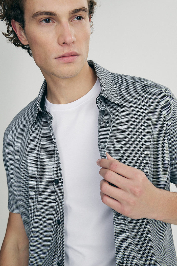 The houndstooth knit shirt, featuring a subtle yet striking pattern, offers a refined fit ideal for a polished, modern look. Its breathable texture makes it a versatile addition for any season. Perfect for both professional and casual settings, this shirt complements streamlined trousers or adds depth when worn over a basic T-shirt.