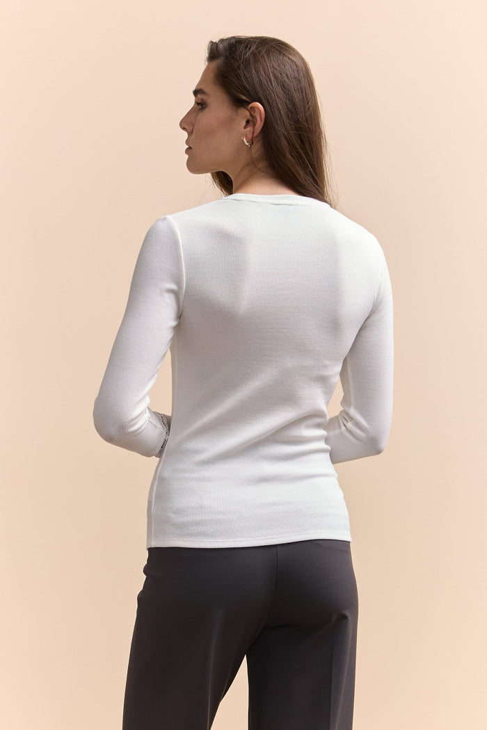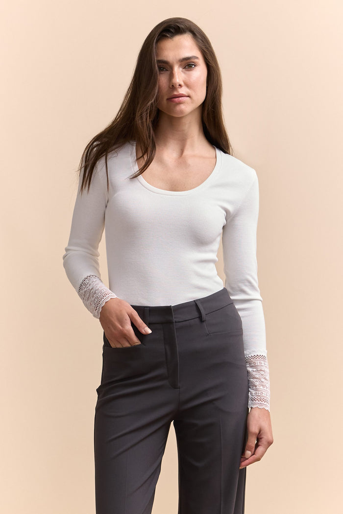 Discover the allure of this jersey top, featuring delicate lace sleeves that blend sophistication with comfort. Perfectly paired with tailored pants or layered under a blazer, this versatile piece seamlessly transitions from day to night. The breathable fabric ensures a soft fit, making it a wardrobe essential for every occasion.