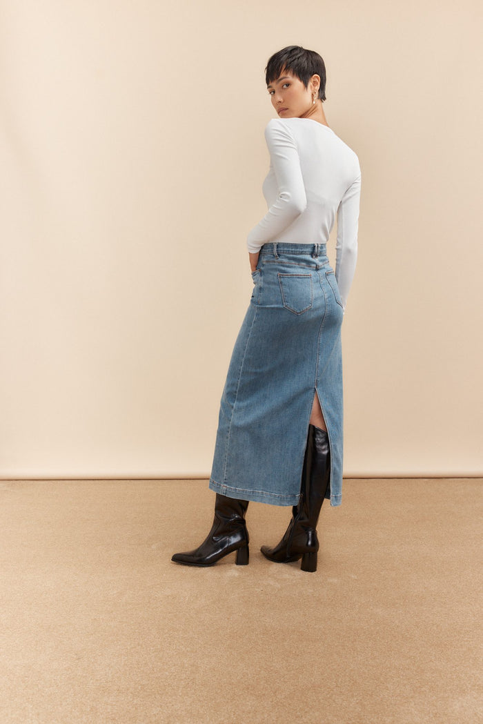 Rediscover timeless style with this long denim skirt, perfect for the modern woman. Its soft, durable fabric ensures comfort, while the classic design seamlessly fits into your everyday wardrobe. Pair with a simple white top and boots for a chic, effortless look. *Note*: Details are based on the image provided