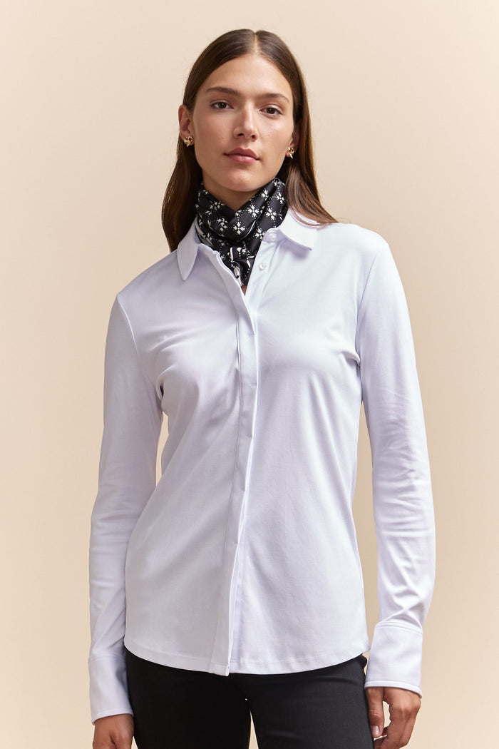 Discover comfort with a polished edge! This exquisitely tailored shirt, crafted from luxurious mercerized cotton jersey, is designed for those who value both style and refinement. The silky smooth fabric caresses the skin, offering a breathable and soft touch, ideal for all-day wear. Pair it with a chic scarf for an elegantly complete ensemble.