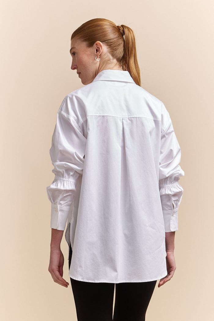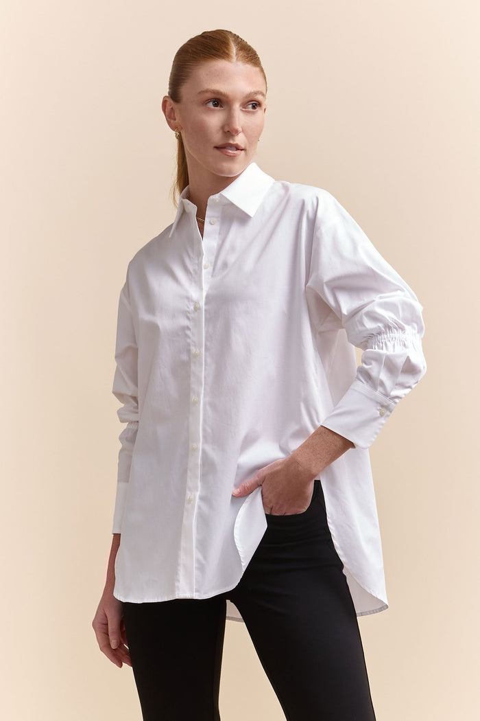 Redefine your wardrobe with our sophisticated oversized shirt featuring delicate elasticized sleeves. Crafted from soft, breathable cotton fabric, this shirt pairs easily with your favorite trousers for a smart-casual look, or a sleek skirt for a polished finish.