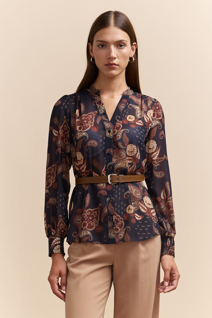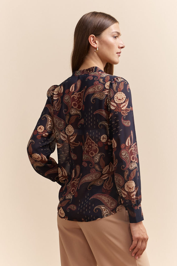 Turn heads with this exquisite printed shirt featuring graceful puffy sleeves. The rich, paisley pattern and deep tones create a perfect blend of sophistication and style. Made from a lightweight, breathable fabric, it ensures comfort all day long. Pair it with tailored pants or a pencil skirt, and accentuate your waist with a chic belt for a refined look. Ideal for both work and weekend outings, this shirt is your new wardrobe essential.