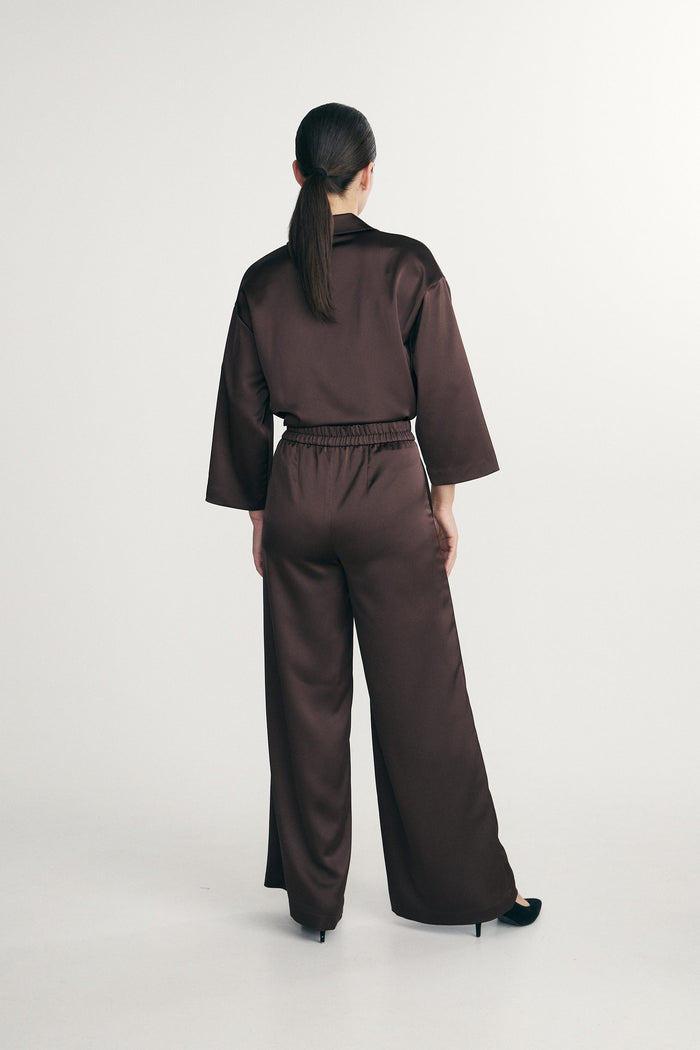 This satin blouse offers unmatched comfort with its loose, slightly cropped fit. Ideal for layering or wearing alone, its fluid fabric adds a touch of sophistication to your outfits. Perfect for any occasion, it combines modernity and versatility.