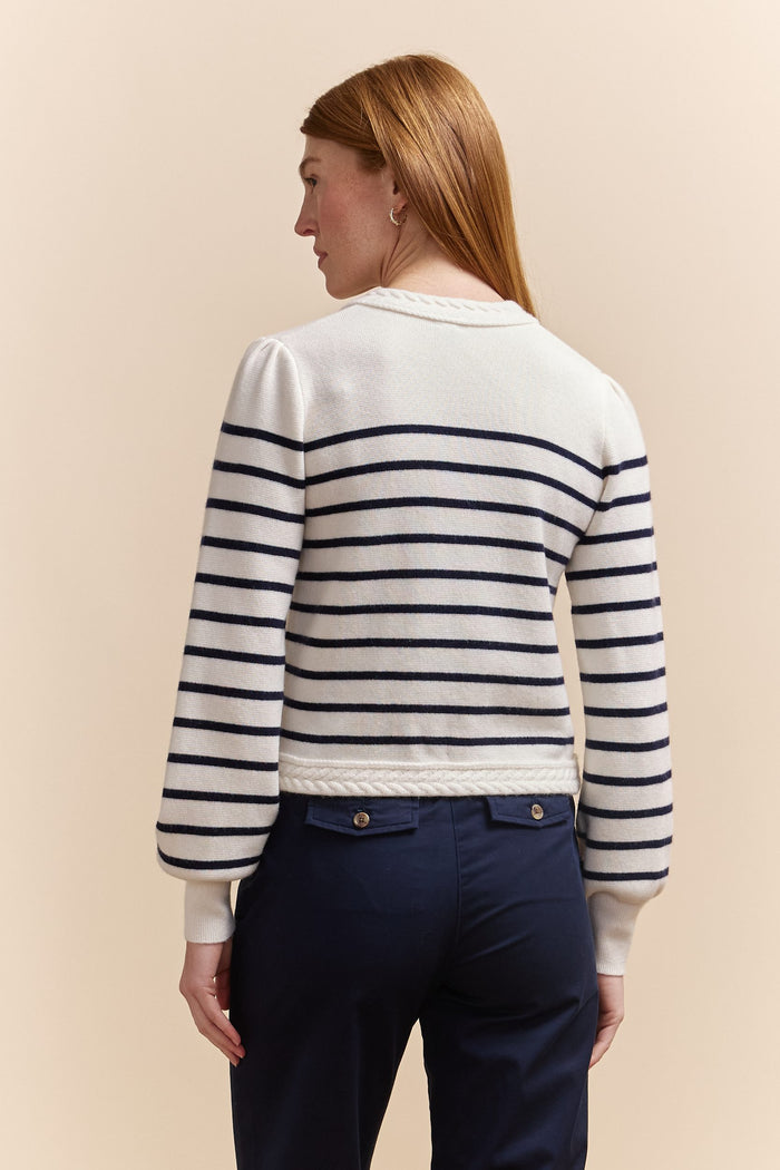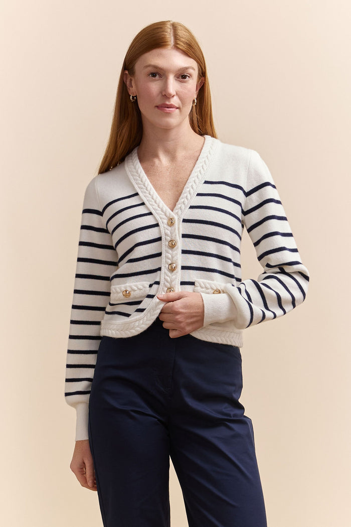 Wrap yourself in comfort with this striped cardigan crafted in a luxurious blend of soft wool and cashmere. The classic navy and white stripe pattern offers timeless appeal, while ornate buttons add an elegant touch, perfect for any occasion. The plush material promises warmth and coziness, making this cardigan an essential piece for your wardrobe